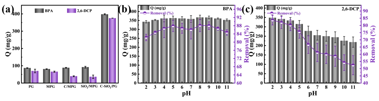The FT-IR and XPS results mentioned above indicate that hydrophobic and hydrogen bonding interactions play a key role in the adsorption of BPA and 2,6-DCP. Adsorption experiments under a wide range of pH conditions showed that C-SiO