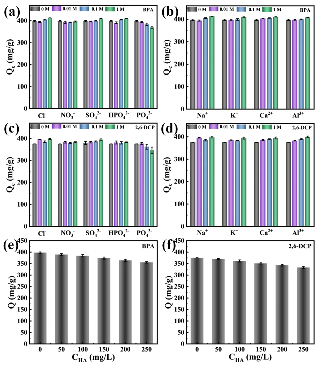 The effects of typical inorganic ions and organic matter on the adsorption of BPA and 2,6-DCP were investigated. Electrolyte ions and HA were introduced into the solution. Four different concentrations (0, 0.01, 0.1, and 1 mol/L) were set to study the effects of cations and anions on the adsorption of phenolic pollutants. Sodium salts were used when studying the effects of different anions (Cl