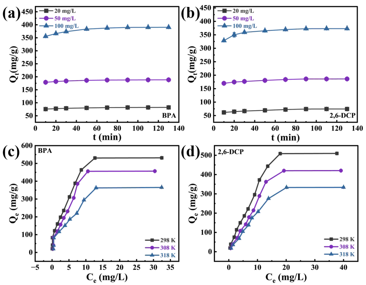 7]. The saturated adsorption capacities obtained by fitting the experimental results of BPA and 2,6-DCP with the Langmuir model are 561.79 mg/g and 531.91 mg/g, respectively.