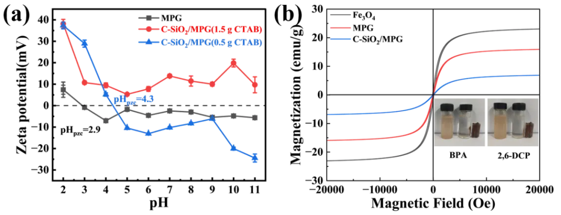 2/MPG exhibited good adsorption of molecular BPA and 2,6-DCP under acidic and neutral conditions. According to the difference in zeta potential and the adsorption capacity of the two phenols, it can be verified that there is almost no electrostatic attraction between C-SiO