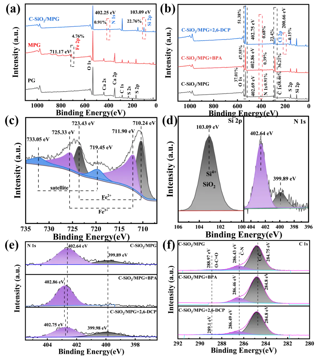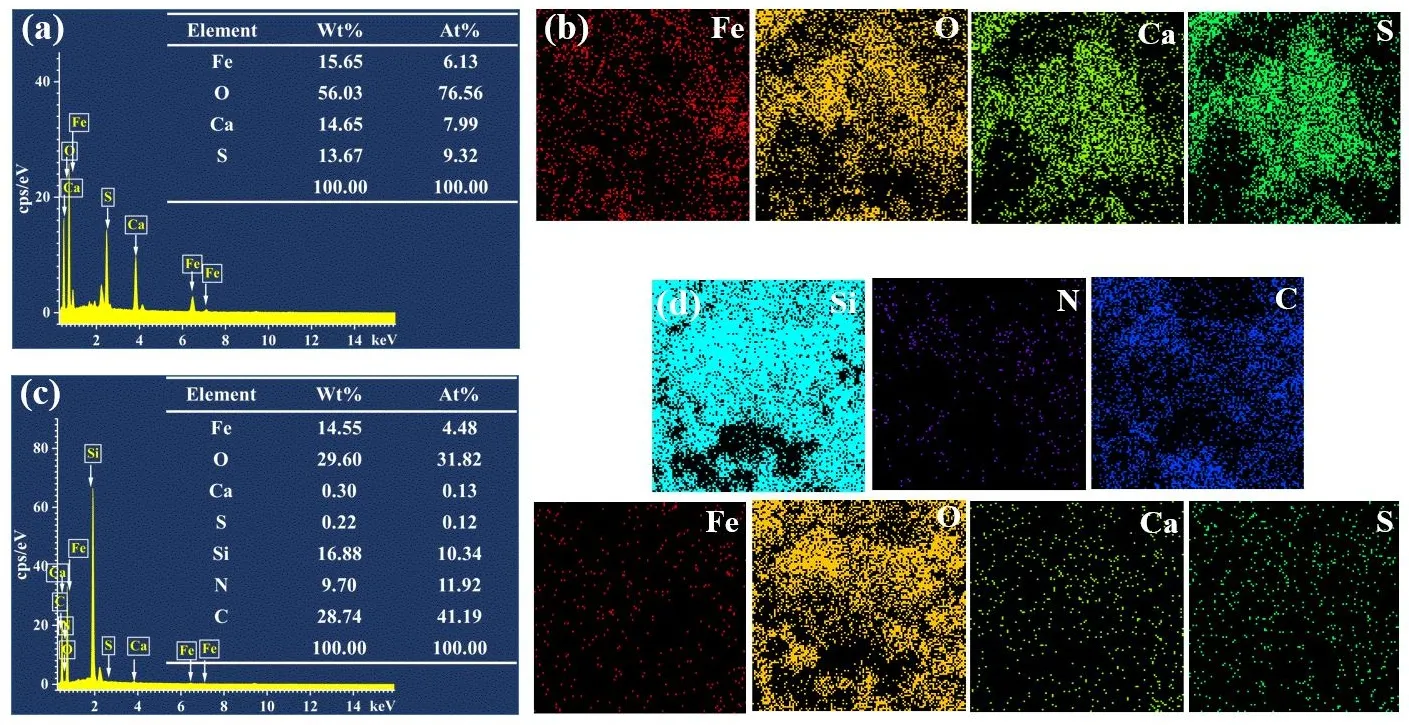 4 particles are evenly coated on the surface of PG, which also confirms the presence of Fe, O, Ca, and S. c shows that in addition to the Fe, O, Ca, and S signals present in MPG, the presence of Si, N and C element signals confirm the formation of C-SiO