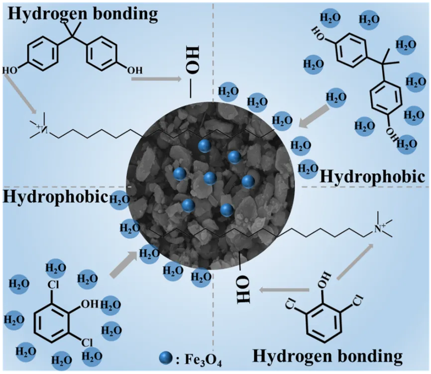 . Schematic diagram of the adsorption mechanism of BPA and 2,6-DCP on the hydrophobic magnetic composite C-SiO<sub>2</sub>/MPG.