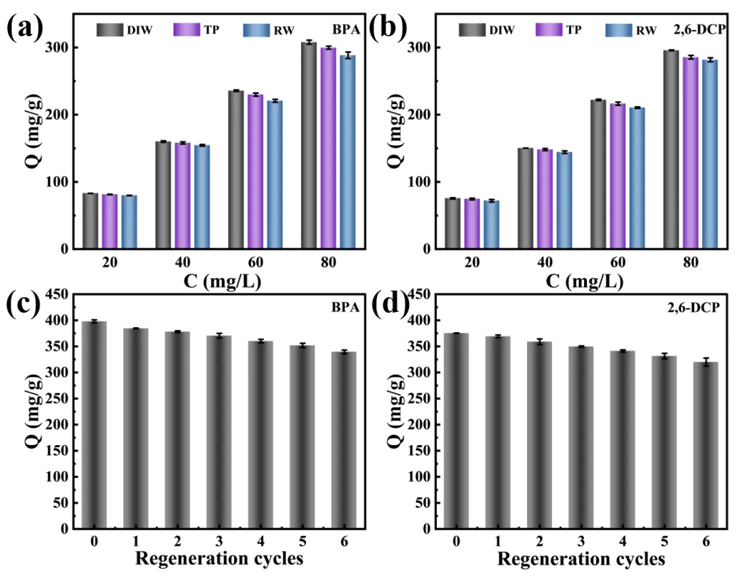 . Adsorption performance of C-SiO<sub>2</sub>/MPG for (<b>a</b>) BPA and (<b>b</b>) 2,6-DCP in real water samples; regeneration experiment after C-SiO<sub>2</sub>/MPG adsorbs (<b>c</b>) BPA and (<b>d</b>) 2,6-DCP.