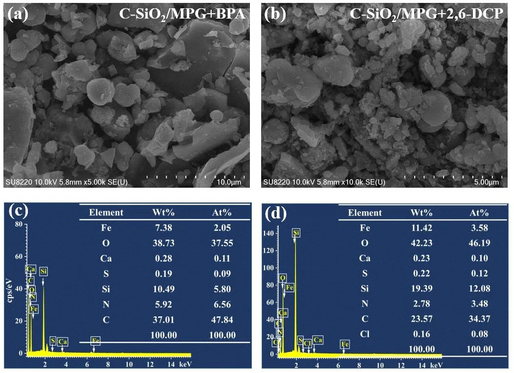 2/MPG after adsorption of BPA and 2,6-DCP. In comparison, the surface morphology has not changed significantly. The energy spectrum analysis of c,d shows that the content of C and O elements in C-SiO