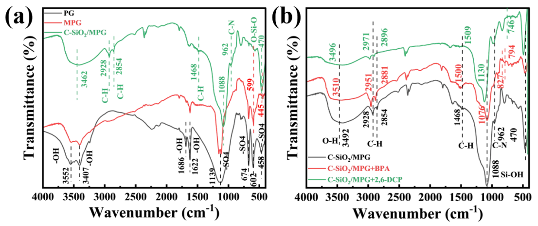 2/MPG and the -OH of BPA and 2,6-DCP molecules. Based on the results of FT-IR, XPS and pH studies, the potential mechanism of enhanced adsorption of BPA and 2,6-DCP by C-SiO