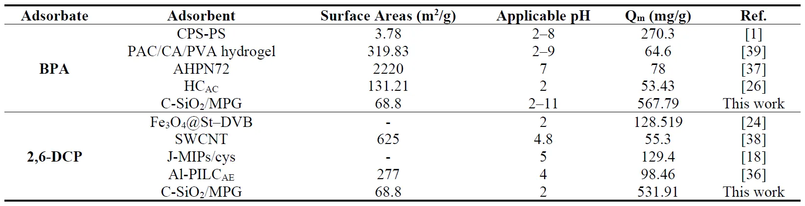 2/MPG with BPA and 2,6-DCP adsorbents reported in the literature based on several factors.