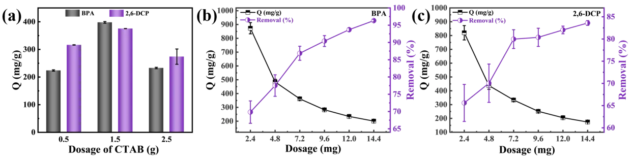 The adsorption amount of BPA is higher than that of 2,6-DCP, which indicates that the hydrophobic C-SiO