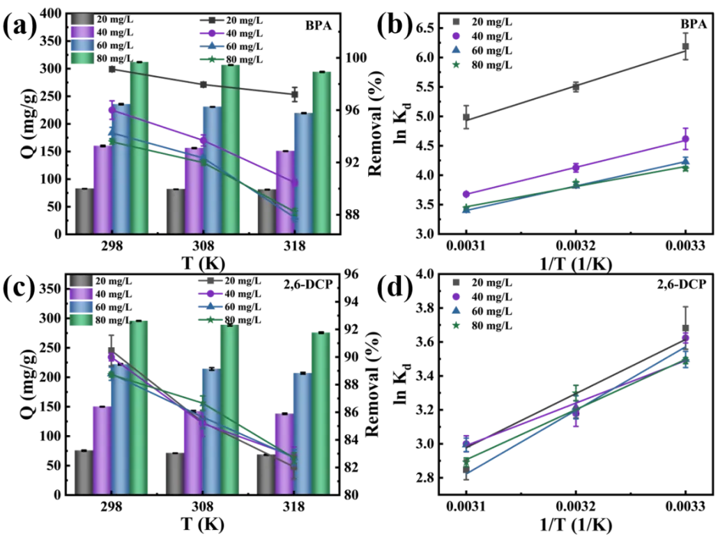Thermodynamic studies provide information on the spontaneity, endothermicity or exothermicity of the adsorption phenomenon and the potential increase or decrease in randomness at the solid/liquid interface, the parameters of which can serve as the basis for explaining the adsorption mechanism. As shown in a,c, the increase in temperature leads to a decrease in the adsorption amount and removal rate, which can be explained by the weakening of the interaction between BPA and 2,6-DCP molecules and C-SiO