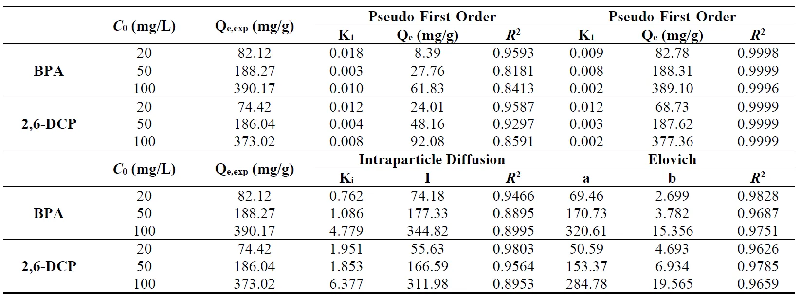 R2 values of BPA and 2,6-DCP adsorption are lower than those of the respective PSO models. Therefore, this model is unlikely to be the rate-controlling step for the adsorption of BPA and 2,6-DCP on C-SiO