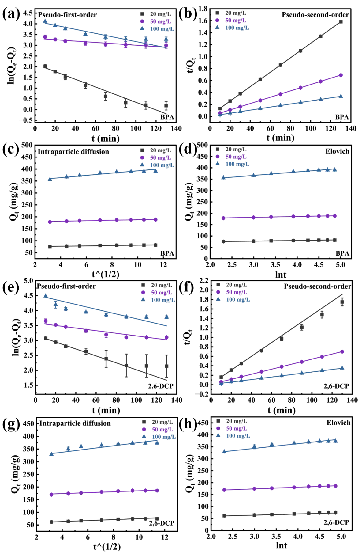 and show the kinetic model fitting diagram and kinetic parameters for the adsorption of BPA and 2,6-DCP. Comparing the results of a–h and , the PSO model fits the experimental data with a higher