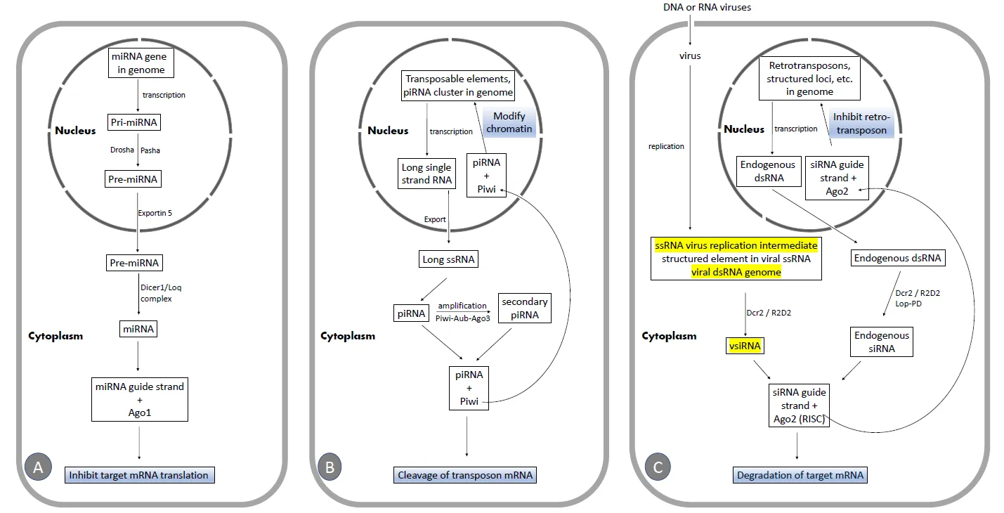 Drosophila melanogaster, there are at least three types of small silencing RNA: the siRNA, the microRNA (miRNA), and the Piwi-interacting RNA (piRNA). These small RNAs differ in their RNA precursor, RNA biogenesis processes, mechanism of action, associated effector proteins, target genes, and biological roles [