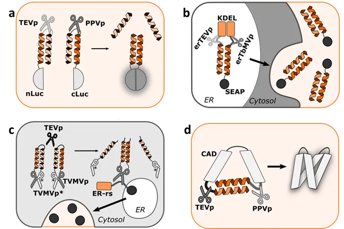 41] created a modular, generalizable design called Retained Endoplasmic Cleavable Secretion (RELEASE) (c). They engineered proteins that were retained in the endoplasmic reticulum and displayed or secreted in response to specific proteases. Reconstitution of their designed split proteases was based on coiled coil interaction.