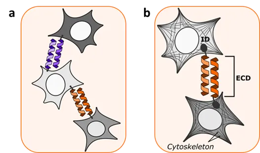 45] systematically explored the modularity of CAMs. They prepared several synthetic CAMs (synCAMs) by fusing orthogonal extracellular binding domains (ECD) to endogenous CAM intracellular domains from native adhesion molecules (b). Contrary to helixCAM, the synthetic CAMs contained a preserved intracellular domain. In one of the designs they prepared a homotypic synCAM where self-dimerizing Aph (computationally designed) or IF1 (bovine ATPase inhibitor IF1) coiled coils were used as ECD. Those were fused to the extracellular domain of fibronectin, providing additional separation from the cell membrane, and then linked to transmembrane and intracellular domain from ICAM-1. Mixed cells expressing orthogonal synCAMs formed self-organizing structures in a modular manner which can be predicted according to expressed synCAM.