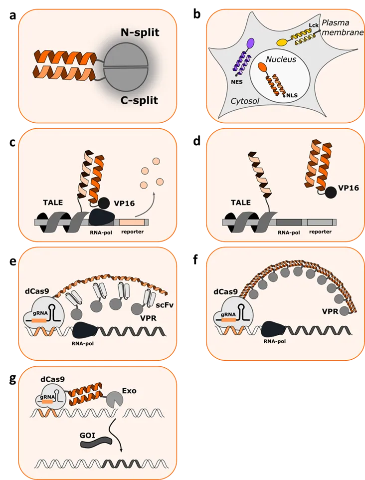 38] designed an enhanced gene editing method by recruiting exonuclease to Cas9/gRNA via coiled coil interaction, termed CCExo (g). This method robustly increased gene knock-out due to progressive DNA strand recession at the cleavage site, decreasing the re-ligation of the non-edited DNA. Implementation of CCExo increased deletion size and enhanced gene inactivation efficiency in the context of several different DNA targets, gRNA selection, Cas variants, tested cell lines, and types of delivery. Coiled coil dimer forming modules are also a useful tool as a screening method for the detection of effective split proteins (a). Golob-Urbanc et al. [