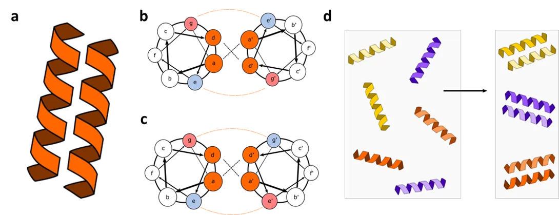 9], coiled coils (CC) (a) are widespread structural motifs in natural proteins. Approximately 2–3% of all protein residues are in coiled coil segments and as such, they are involved in diverse organizational and regulatory processes. They perform both structural and functional roles and act in protein–protein interaction as well as in DNA-binding domains [