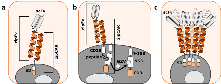 49] developed a collection of versatile protease regulated (VIPER) CAR receptors using viral non-structural protein 3 (NS3) with proteolytic activity, and an exogenous control with clinically approved antiviral drugs (b). To create a universal CAR receptor that could be switched ON and OFF on the demand, they applied the OFF VIPER CAR design to a SUPRA CAR technology. The three-component system is composed of zipFv, and similar to SUPRA CAR, meanwhile, intracellular zipCAR is divided into two parts: the first, consists of an extracellular coiled coil, transmembrane domain, CD28 costimulatory domain, and an NS3-binding peptide; the second is also a membrane-tethered component containing a DAP10 ectodomain, costimulatory 4-1BB domain, catalytically inactive NS3, and CD3ζ signaling domain. Only when all three components are present and the tumor antigen is recognized by zipFv, the CAR receptor is activated. With the addition of the small molecule grazoprevir, that disturbs the binding of NS3-binding peptide and NS3, the intracellular parts of zipCAR are dissociated and the signaling is inhibited. SUPRA CAR and VIPER CAR demonstrate how coiled coils can be a powerful tool for designing universal and tunable CAR receptors.