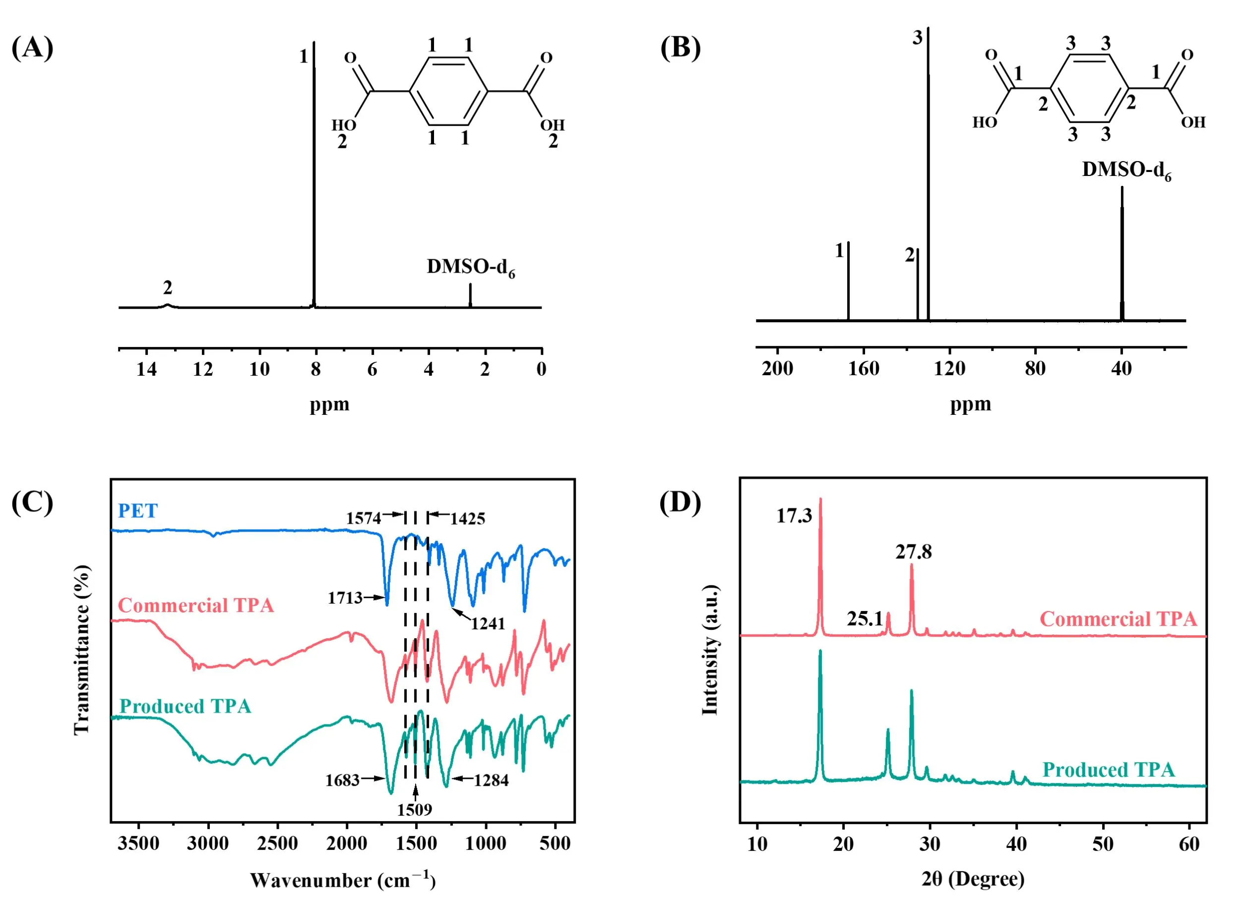 The chemical structure characterization of waste PET and produced TPA were analyzed by Powder X-ray Diffraction (XRD), Fourier transform infrared spectroscopy (FT-IR) and nuclear magnetic resonance (NMR). XRD was obtained on a Rigaku SmartLab SE diffractometer using Cu Kα radiation in a 2