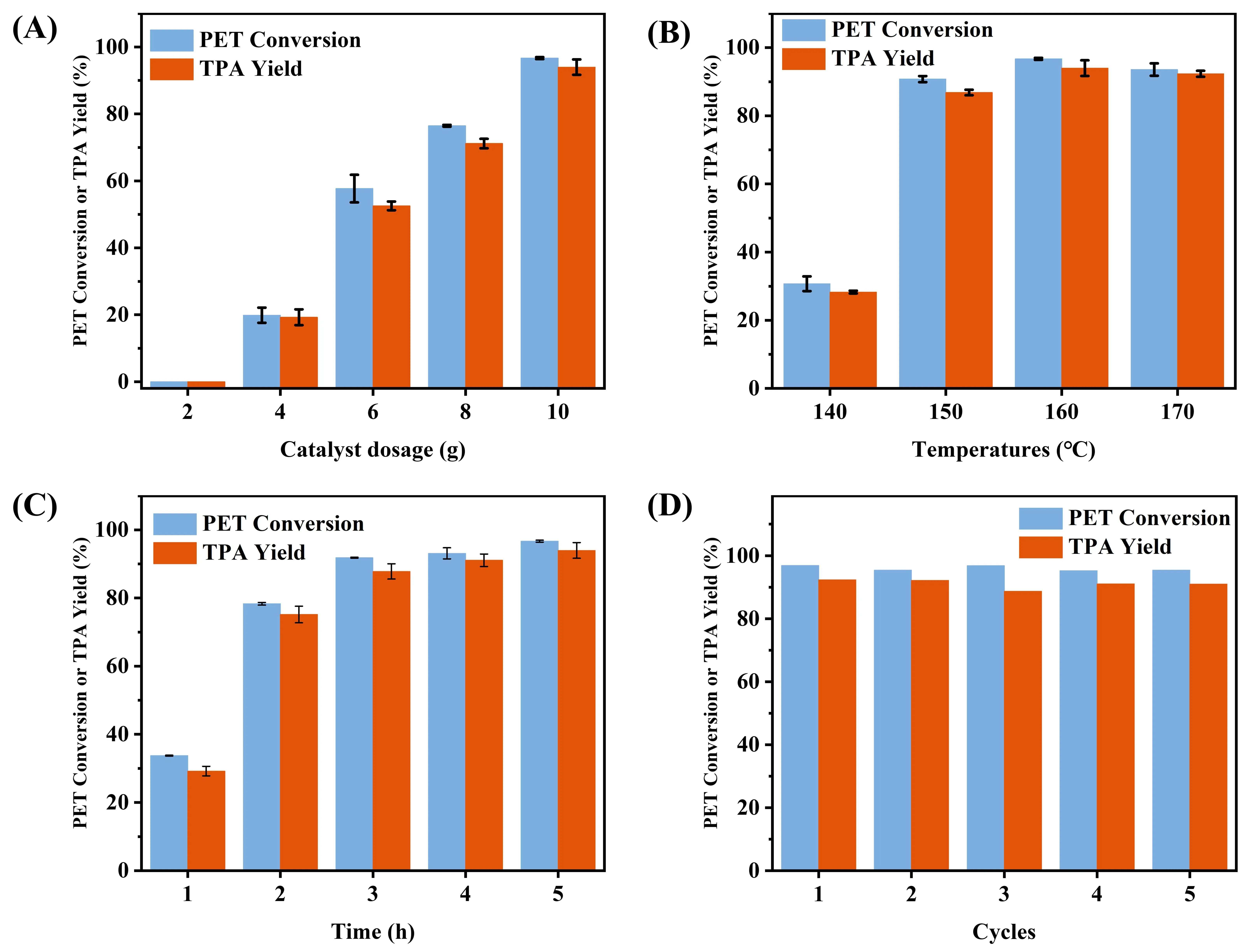 Before the valorization of PET into high-value products, depolymerization into TPA is a crucial step. In this study, PTSA is used as the acid catalyst due to its strong acidity. Subsequently, the effects of catalyst dosage, reaction temperature, and reaction time on PTSA-catalyzed PET hydrolysis are investigated.