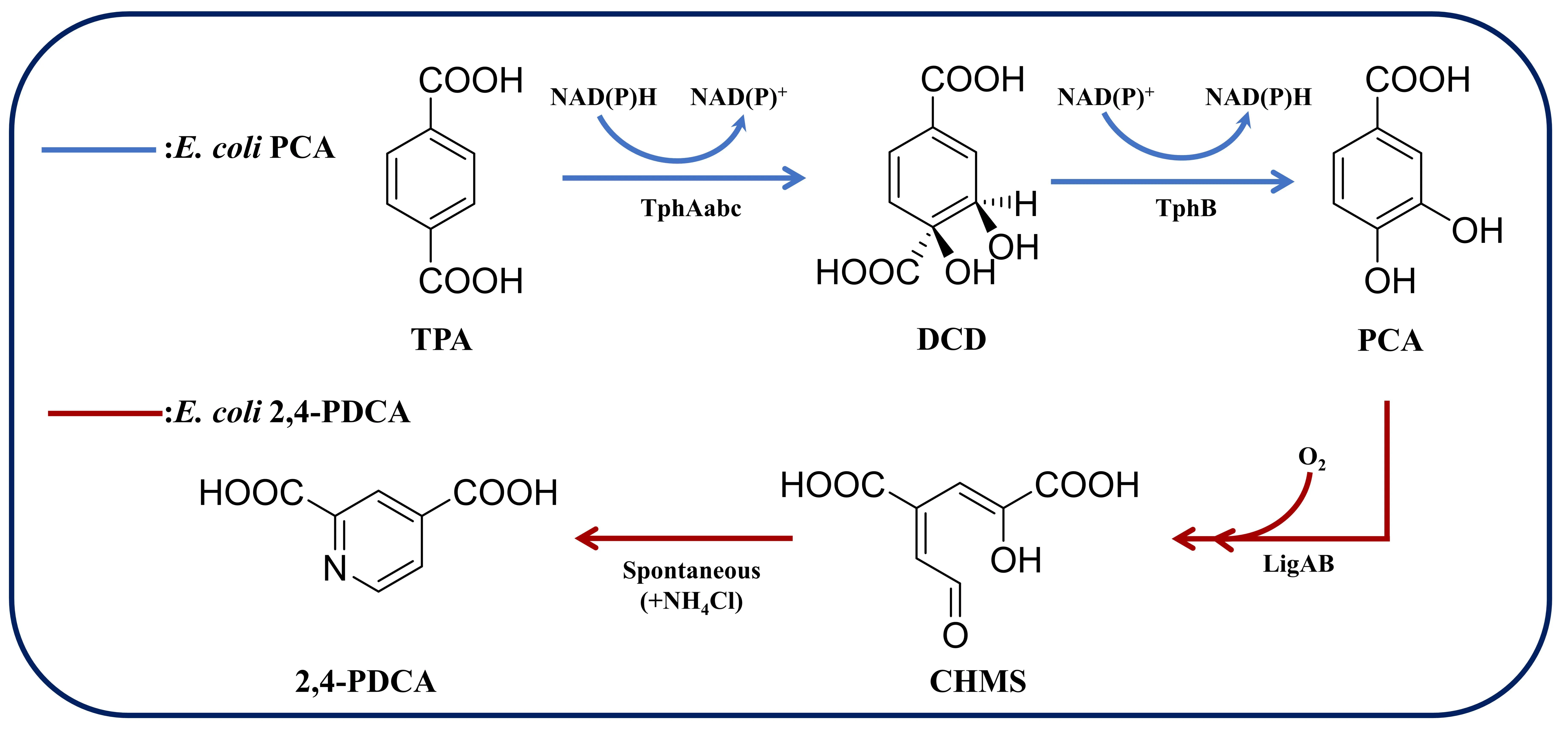 p-toluenesulfonic acid). Following this, TPA monomers were transformed into 2,4-Pyridine dicarboxylic acid (2,4-PDCA) using metabolically engineered whole-cell