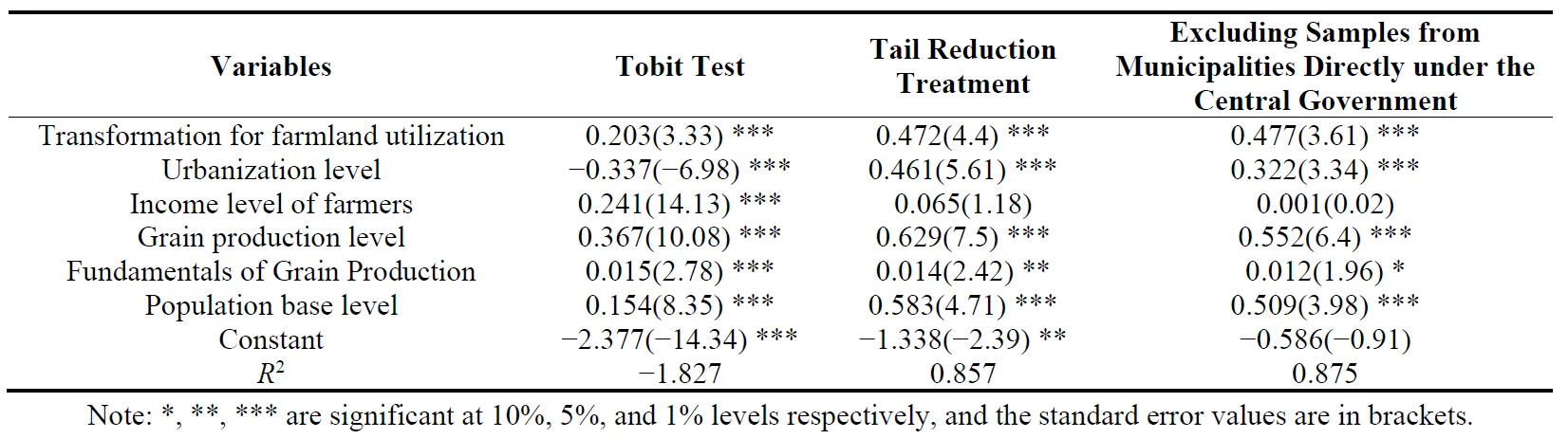 24]. The results are shown in the first column of . Comparing the estimation results of the Tobit model and the OLS model, the impact direction of farmland utilization transformation remains unchanged and remains significantly positive at the statistical level of 1%. The estimation results after replacing the model are consistent with the conclusions of the benchmark regression results.