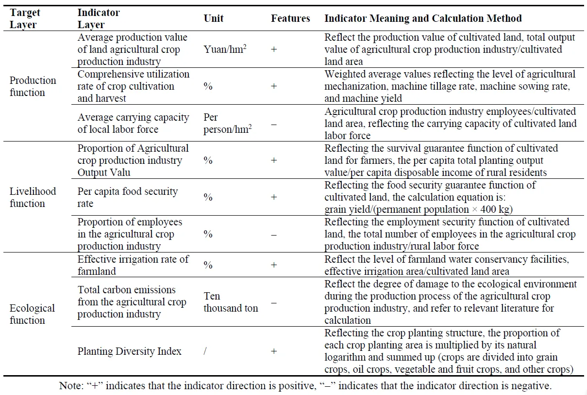 23], the implicit transformation for cultivated land use is characterized by the “three generative” function of farmland. Among them, crop production and planting capacity are the basic functions of cultivated land utilization. This article selects indicators such as the output value of the per capita agricultural crop production industry, the comprehensive utilization rate of crop cultivation income, and the carrying capacity of the per capita labor force to measure. Life function refers to the carrying capacity of living security provided by cultivated land, mainly referring to the ability of cultivated land to maintain farmers’ livelihoods, reduce unemployment risks, and provide material supplies such as food, fruits and vegetables for social stability and development. This article selects indicators such as the proportion of agricultural crop production industry output value, per capita food security rate, and the proportion of agricultural crop production industry employees to measure. Ecological function is an important supporting condition for ensuring the sustainable development of farmland production and living functions, reflecting the service capacity of the farmland system. This article selects indicators such as the effective irrigation rate of farmland, total carbon emissions from the agricultural crop production industry, and planting diversity index to measure. refers to evaluation index system for cultivated land use transformation.