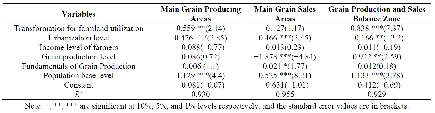 Due to significant differences in geographical conditions and resource endowments among different provinces in China, there is also significant heterogeneity in the utilization and production status of cultivated land and the development level of the agricultural crop production industry. To further investigate the regional differences in the impact of cultivated land use transformation on the economic resilience of the agricultural crop production industry, this article will conduct regression estimation on the model from three perspectives: the main grain production areas, the main grain sales areas, and the grain production sales balance areas. The specific estimation results are shown in .