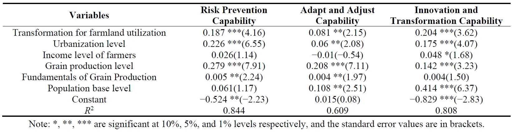 This article divides the economic resilience of the agricultural crop production industry into three dimensions: risk prevention ability, adaptability and adjustment ability, and innovation and transformation ability. The impact of farmland utilization transformation on each dimension will inevitably vary. Therefore, this article further examines the effect of farmland use transformation on the economic resilience of the agricultural crop production industry from the perspective of dimensional heterogeneity. shows the regression results of dimensional heterogeneity.