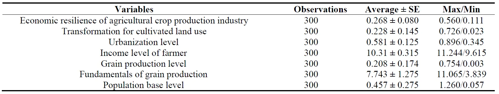 (3) Control variables: To control for the impact of other factors on the economic resilience of the agricultural crop production industry, this article selects the following control variables: ① urbanization level, expressed as the proportion of urban population to the total population (%). ② The income level of farmers is expressed as per capita disposable income of rural residents (yuan). The level of grain production is expressed in terms of grain yield (10,000 tons). Grain production foundation isexpressed in terms of grain sown area (in thousands of hectares). The level of population base, expressed in total population (10,000 people). Based on unified dimensions, five indicators are introduced as control variables into the model analysis to control the impact of other factors on the economic resilience of the agricultural crop production industry.