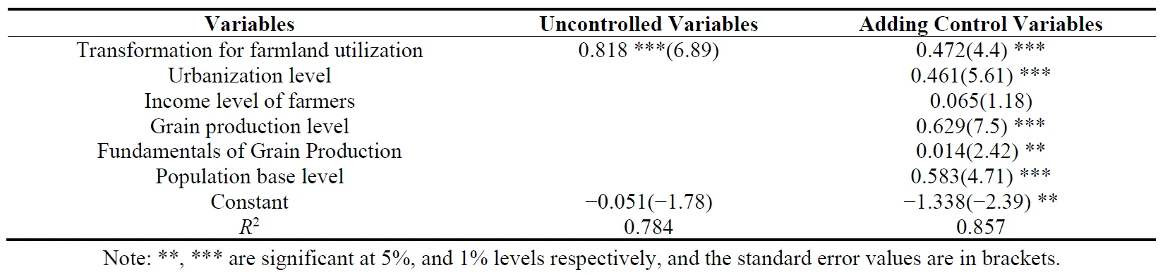 Among them, in the first column, based on controlling for individual and time-fixed effects, a simple regression was conducted using the transformation for cultivated land use to assess the economic resilience of the agricultural crop production industry, and the estimated coefficients were significantly positive at the 1% statistical level; The second column adds other control variables on the basis of simple regression, and the results show that the estimated coefficient of cultivated land use transformation is still significantly positive at the statistical level of 1%. This preliminarily proves that the higher the level of cultivated land use transformation, the stronger the economic resilience of the agricultural crop production industry.