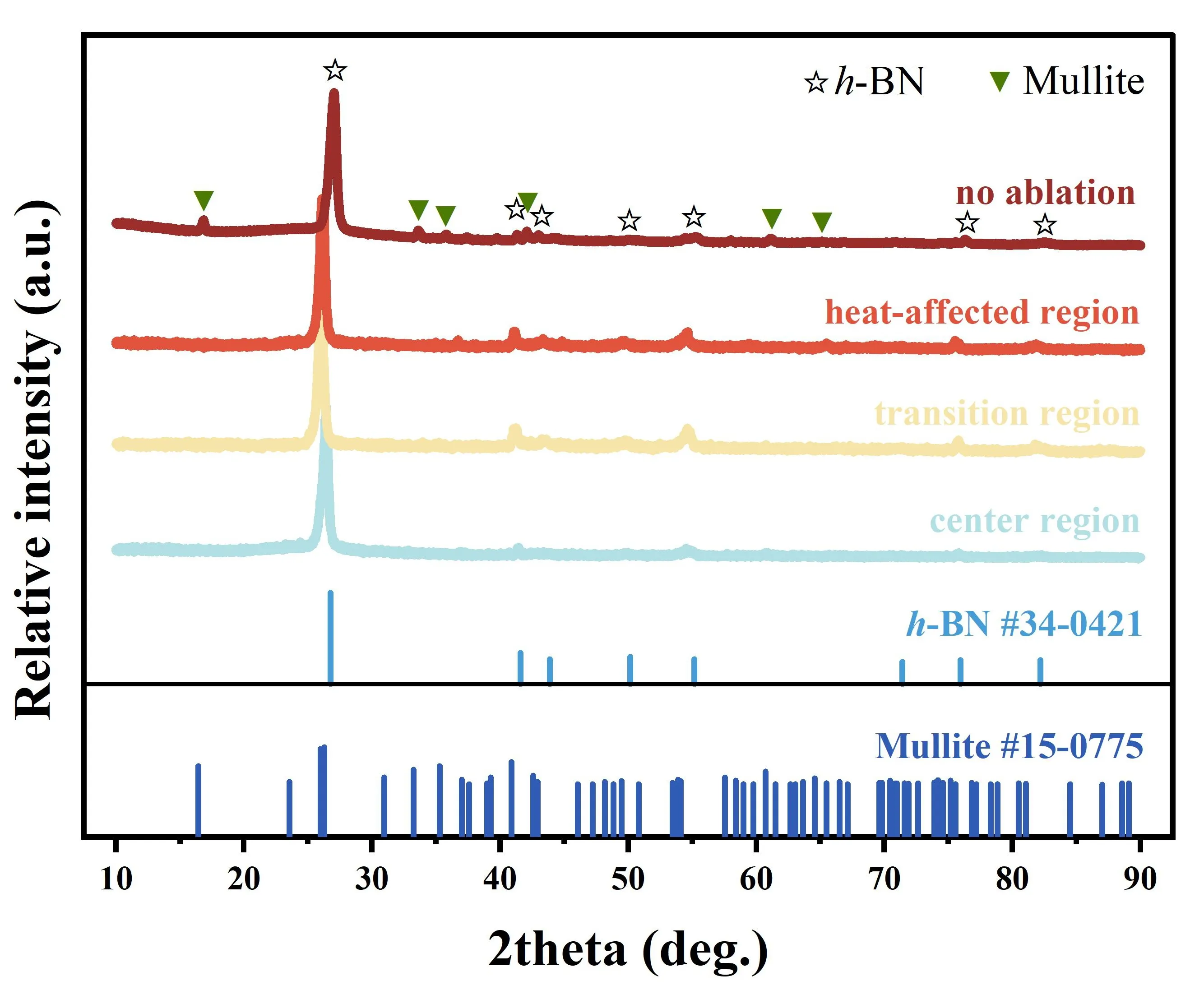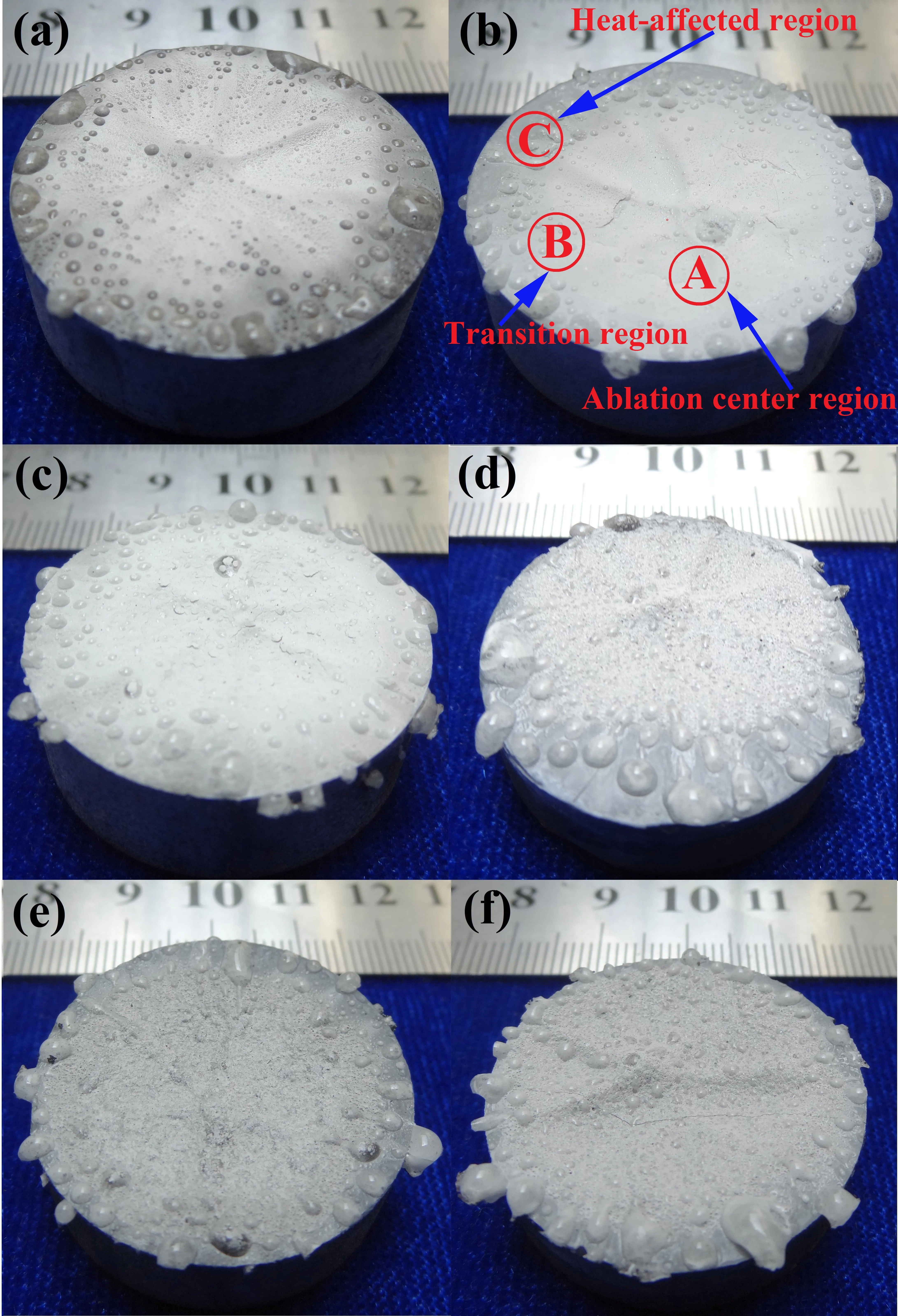 presents the macroscopic photographs of the BN-MAS composite surfaces after ablation in an oxyacetylene combustion flame with varying MAS content. Due to thermal stress and gas flow scouring, the surface showed noticeable peeling after the ablation test. Based on the changes in surface morphology, the ablated surface can be divided into three regions, as shown in b: the ablation center region (marked as A), the transition region (marked as B), and the heat-affected region (marked as C).