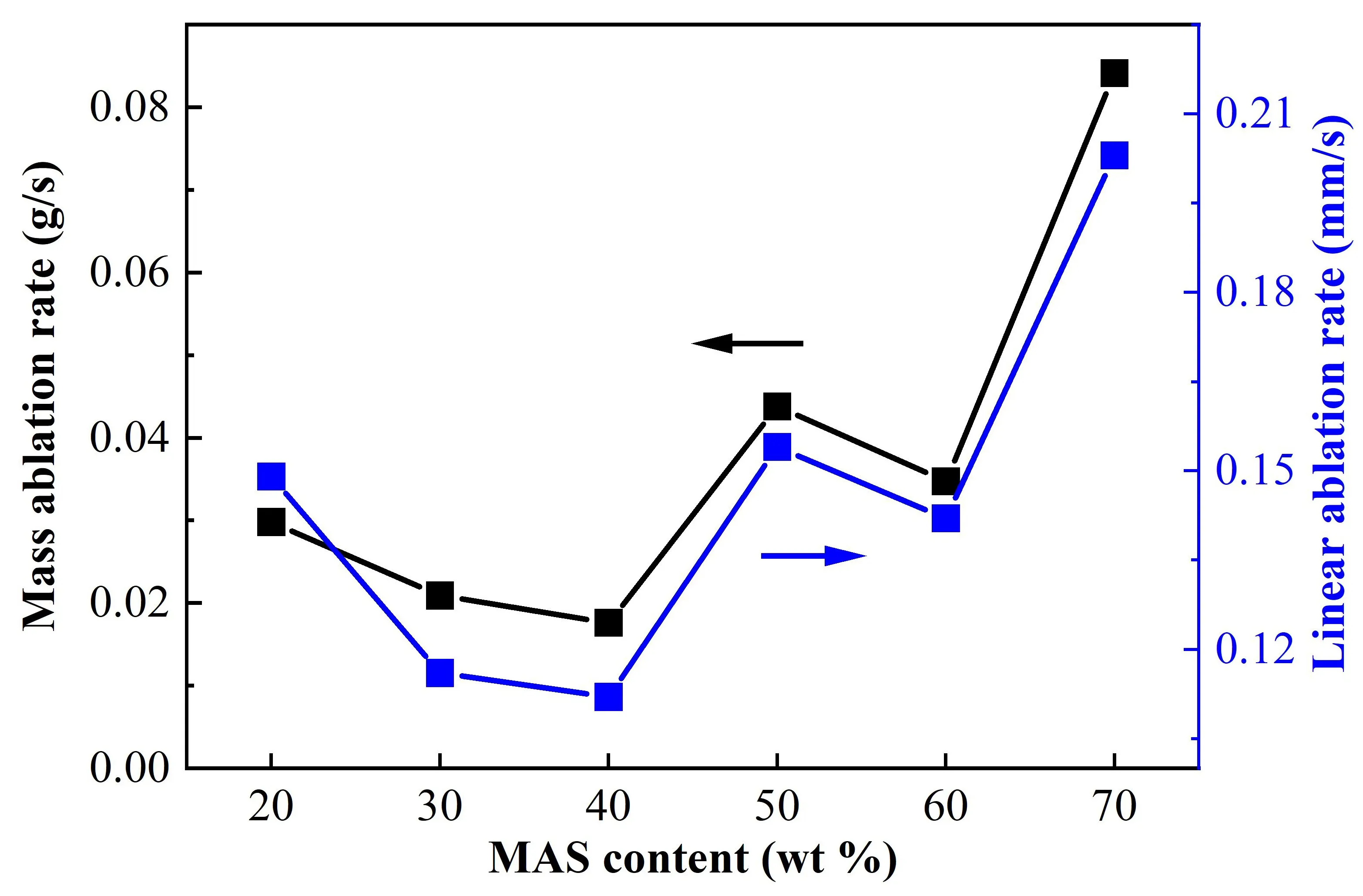 illustrates the variation in surface temperature of the composites with different MAS contents. Initially, a sharp increase in the surface temperature of the composites is observed. Subsequently, the temperature stabilizes, reaching a maximum of approximately 2090 °C for samples containing 20 wt% MAS and around 1820 °C for those with 60 wt% MAS. Notably, the surface temperature decreases significantly with increasing MAS content. This represents a marked reduction in ablation surface temperature compared to BN-SiO