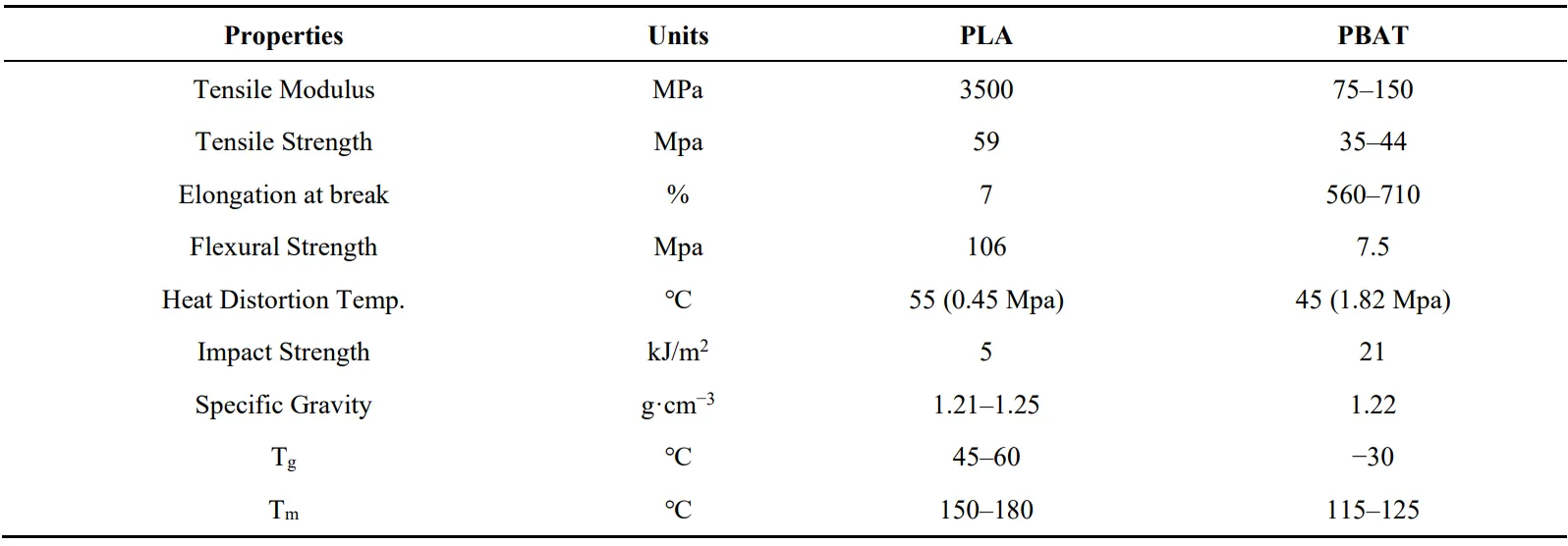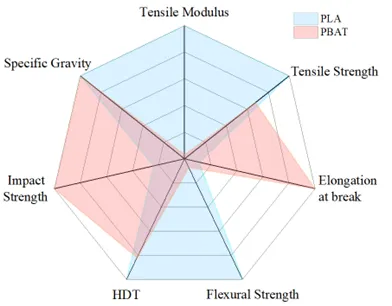 shows that the tensile modulus and flexural strength of PLA are better than PBAT, while impact strength and elongation at break of PBAT is better [