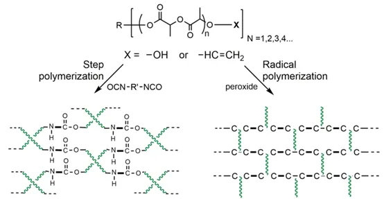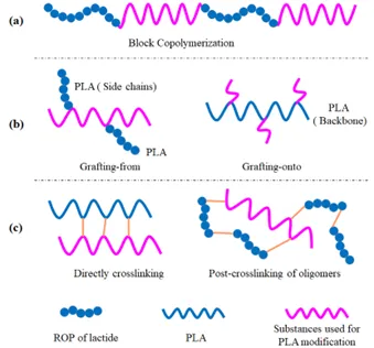 The chemical modification of PLA can be carried out by stereo controlling ring-opening polymerization (ROP) of lactide, by copolymerization reaction such as block copolymerization or graft copolymerization, or by crosslinking or chain extension. As shown in , the PLA-block copolymer can be prepared via ROP of the lactide with other monomers or polymers. Here are three grafting methods: “grafting-from”, “grafting-onto” and “grafting-through”. The first two methods are widely used in the graft copolymerization of PLA: grafting-from ROP of the lactide as side chains; grafting onto PLA with high molecular weight as the backbone. Crosslinking technologies include physical crosslinking and chemical crosslinking. This article mainly discusses the chemical crosslinking of PLA by the chemical reaction of complementary groups. PLA can be directly crosslinking or post-crosslinking of PLA oligomers by ROP of lactide.