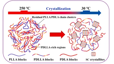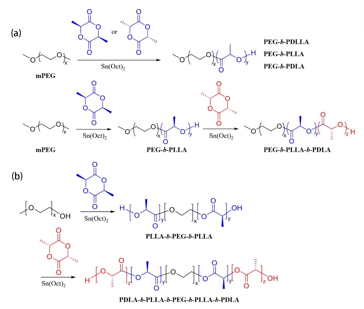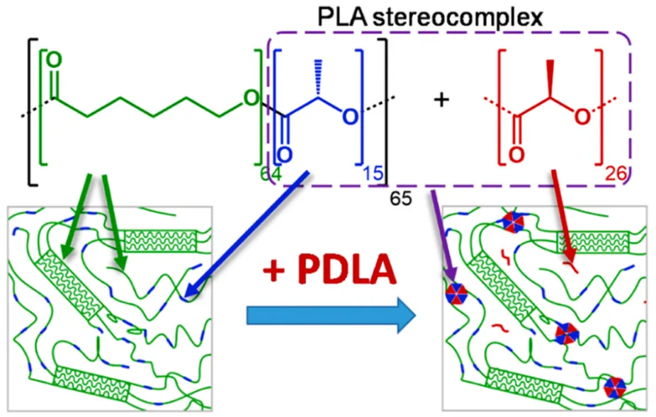 Stereocomplex formation between PLLA and PDLA can improve thermal stability and mechanical properties by copolymerization or blending. Stereocontrolled ROP of *rac*-lactide and *meso*-lactide monomers can be used to synthesize stereo block poly(lactide)s with the blocky stereosequences of L- and D-lactides. Stereo block PLA copolymers include stereo diblock PLA copolymers, stereo triblock PLA copolymers, stereo multiblock PLA copolymers and stereo block PLA copolymers with other types of blocks [