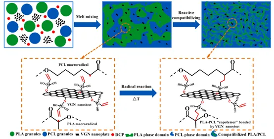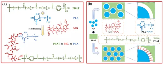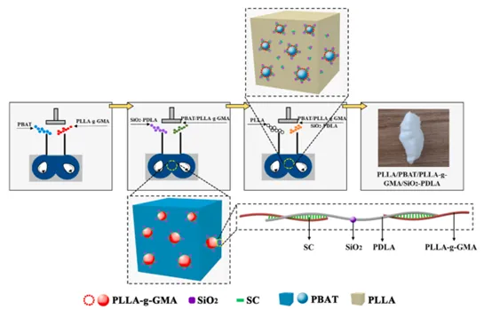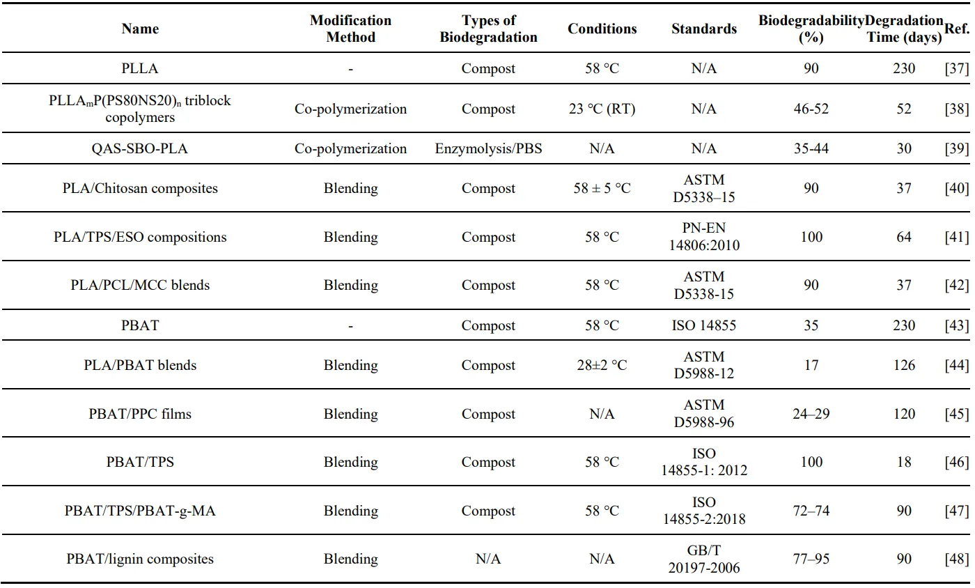 The weaknesses of PLA and PBAT in mechanical properties and low thermal deformation temperature hinder their extensive application in the industrial field. Many studies have been carried out in academic and industrial fields to improve the mechanical properties and thermal stability of PLA and PBAT by physical and chemical modification methods including copolymerization, grafting, crosslinking, blending and compounding. These studies aim that the modification process will not only maintain the biodegradability of PLA or PBAT (), but also improve the performance of the polymer, so as to prepare a more versatile and high-performance biodegradable polymer material.