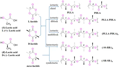 Stereocontrolled ROP of lactide enantiopure monomer can result in the isotactic polymer with the stereocenters aligned along the same side of the polymer chain. Stereocontrolled ROP of *meso*-lactide can lead to either syndiotactic PLA or heterotactic PLA. However, the ROP of racemic mixture (*rac*-lactide) can also lead to heterotactic PLA by alternating insertion of D- lactide (D-LA) and L-lactide (L-LA). Controlling the degree of selectivity, chain exchange and insertion errors of polymer microstructure can synthesise not only enantiopure poly(D-lactide) (PDLA) and poly(L-lactide) (PLLA) chains but also stereoblock copolymers, tapered stereoblock copolymers and multiblock (stereoblock) copolymer. The stereoregularity of PLA materials significantly affects the physical properties and thermomechanical properties. Tacticity can alter polymer melting (T