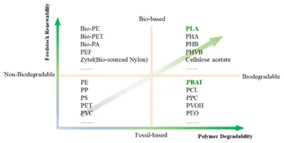 26]. Currently, the global production capacity of degradable plastics is concentrated in PLA and PBAT based bioplastics products, accounting for nearly 59% of the production capacity of biodegradable plastics and more than 38% of the global production capacity of bioplastics. PLA and PBAT are the most promising biodegradable polymer with the greatest research interest and application prospects [