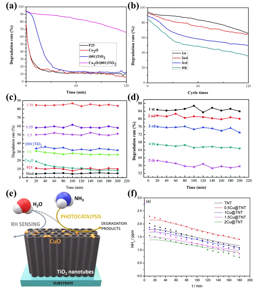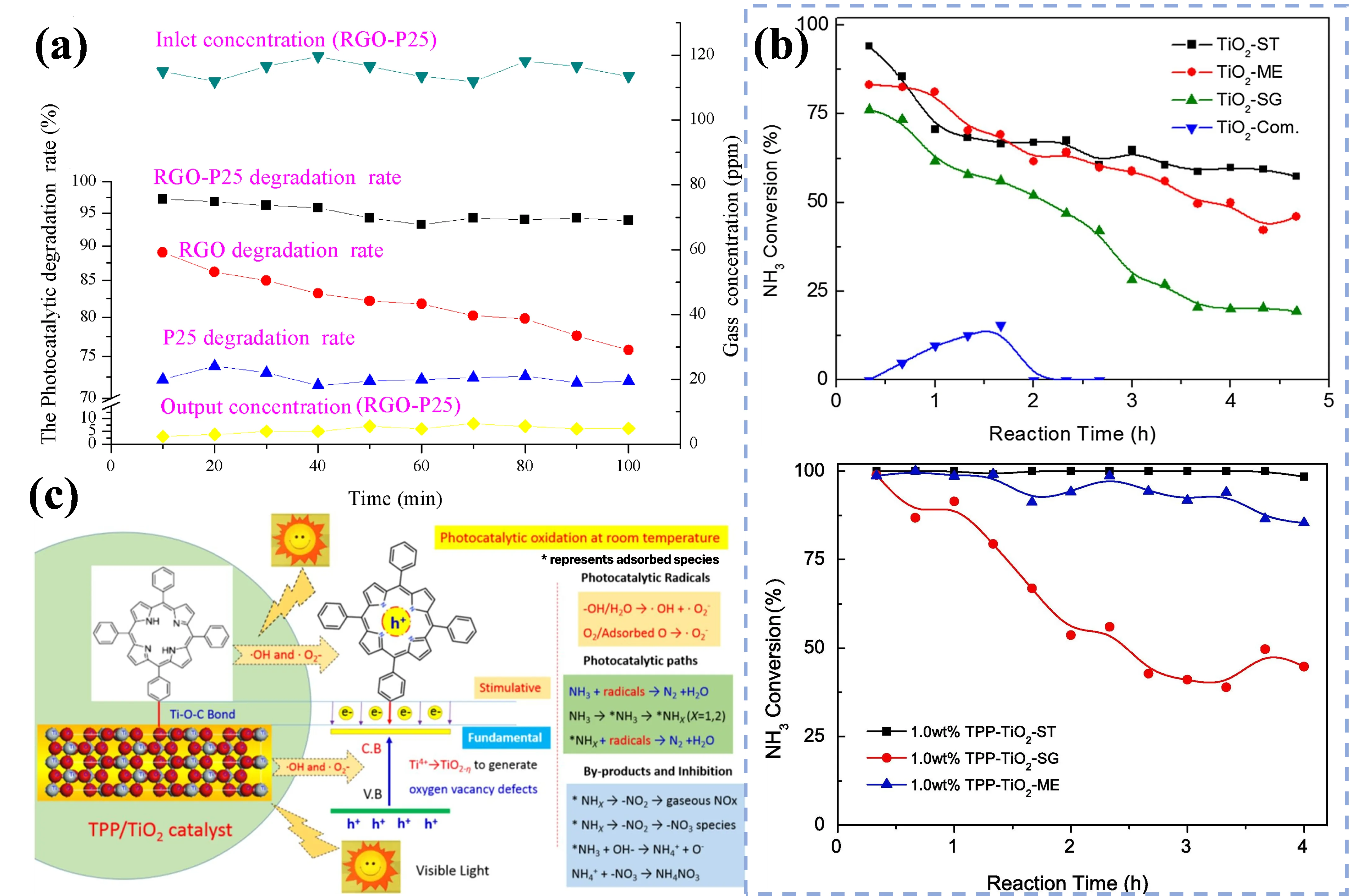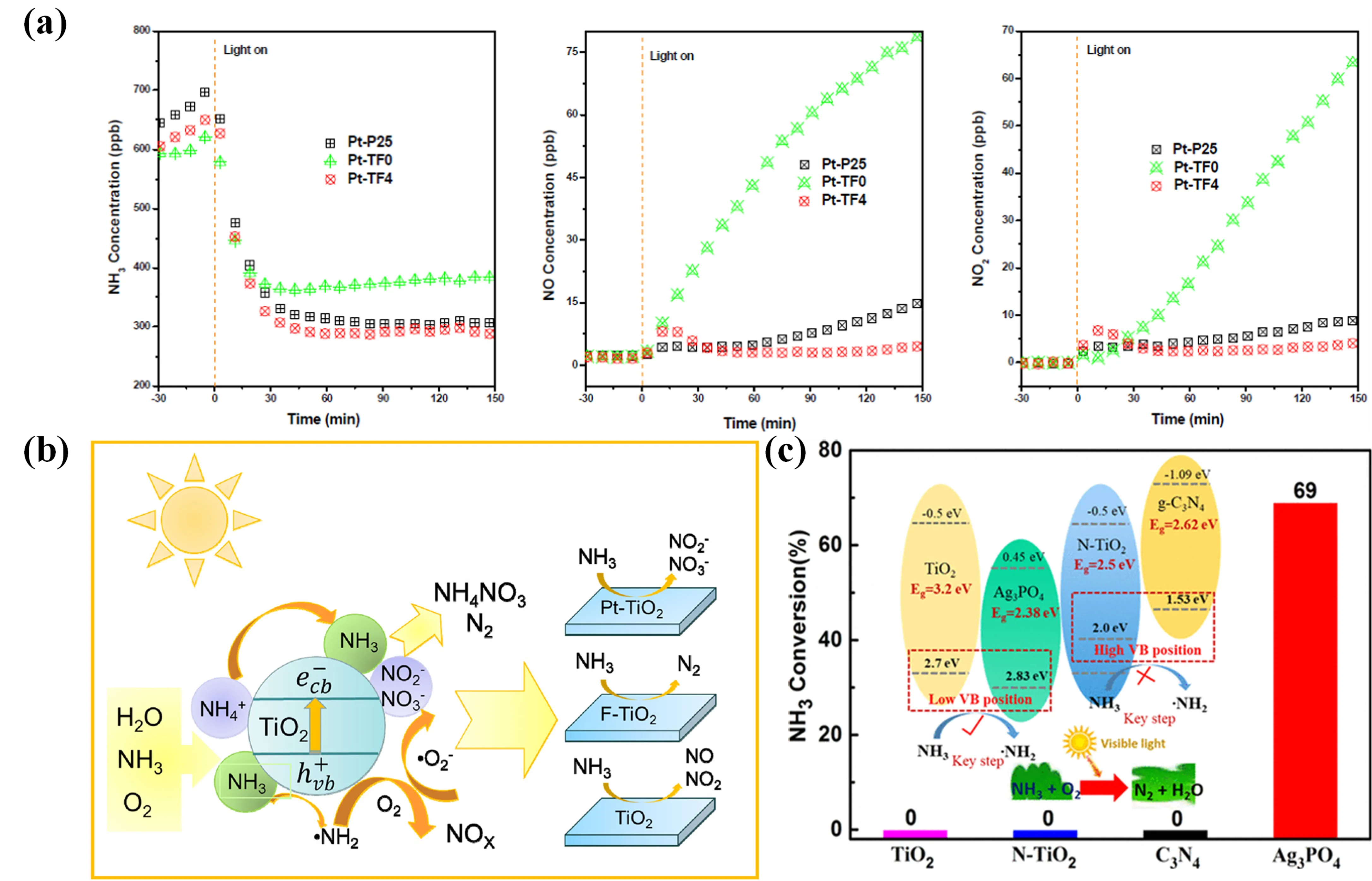 2O at the point source. The design of efficient photocatalysts for NH₃ oxidation, capable of achieving high activity in NH₃ conversion while minimizing the formation of by-products such as NOₓ and N₂O, represents one of the core challenges in this field. In this case, it is necessary to select an economical and efficient photocatalyst with high nitrogen selectivity. As a common photocatalyst, TiO
