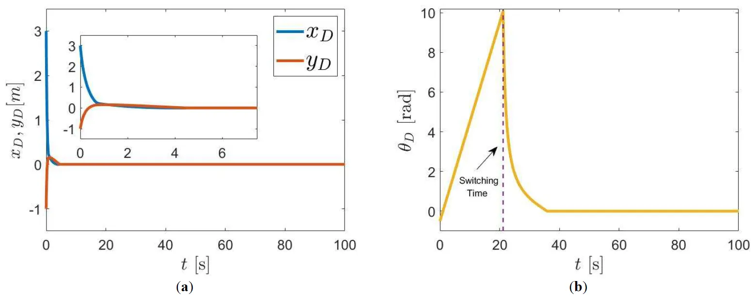 18]. (<b>a</b>) State trajectories $$x_D$$ and $$y_D$$; (<b>b</b>) State trajectories $$\theta_D$$.