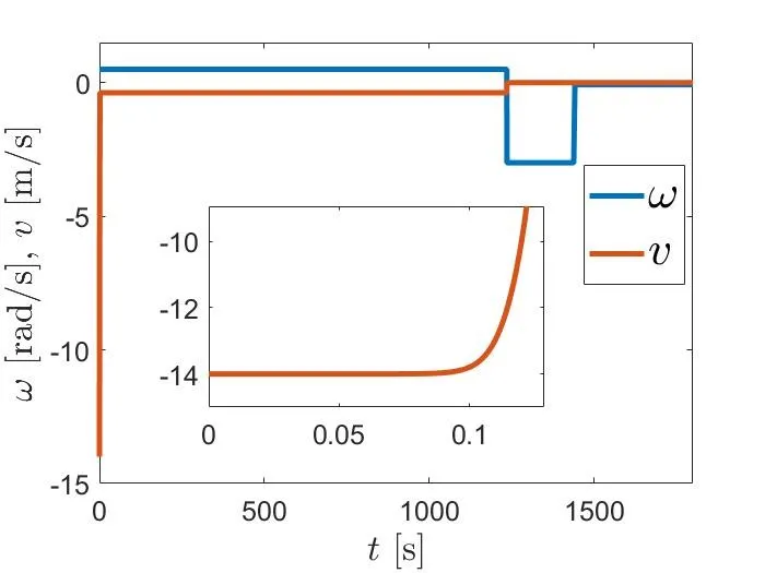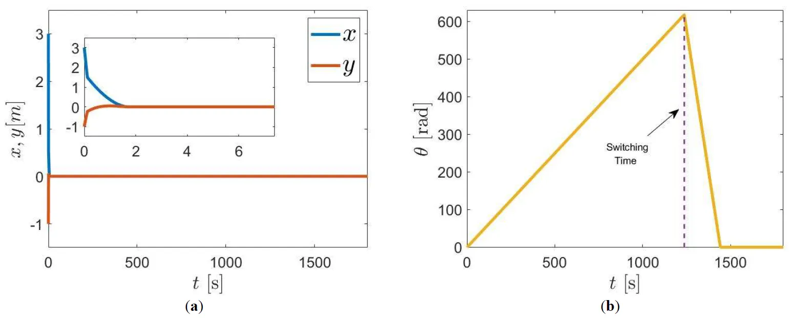 From a,b, it can be seen that the state trajectories $$x , y$$ converge to zero at about $$2 s$$ and $$\theta$$ converges to zero at about $$1440 s$$. It is evident that all states converge to zero in finite time. In addition, from (27), it can be computed that the upper-bound estimate of the closed-loop settling time is $$1545 . 2828 s$$. It should be noted that, before the switching time $$T_{1} \left(z_{0}\right)$$, since $$\omega$$ is a non-zero constant $$c$$, the value of $$\left|\theta\right|$$ increases continuously. When $$t > T_{1} \left(z_{0}\right)$$, the angle $$\theta$$ is stabilized by the controller (6) in a finite time. From , invoking (28), it can be seen that the control inputs are bounded by the prescribed parameters,