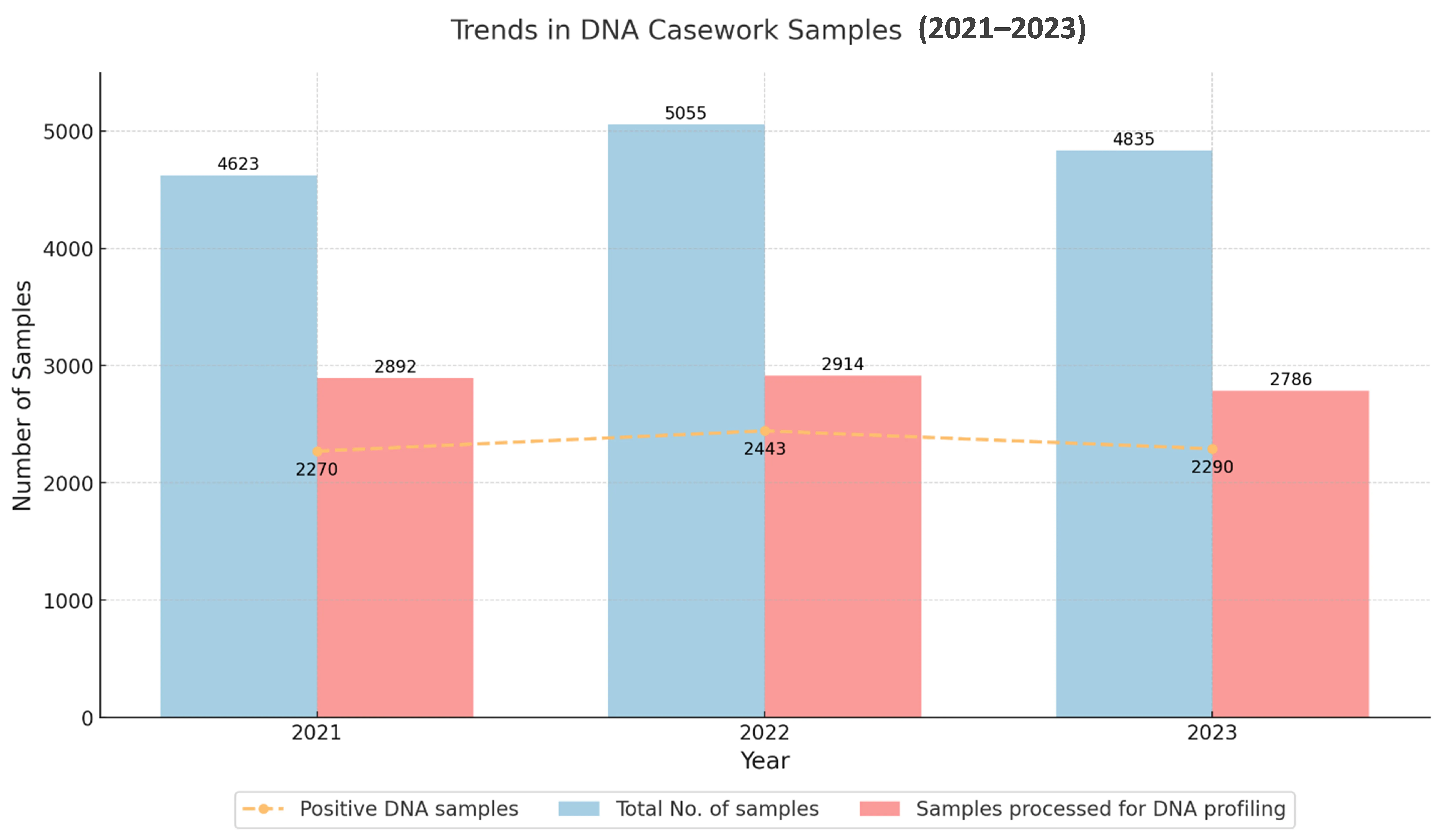 An analysis of year-over-year trends reveals that while the total number of cases declined slightly from 2021 to 2023, the total number of samples collected and the proportion of samples processed for DNA profiling remained consistent. The proportion of processed samples relative to collected samples (59.2%) indicates a sustained operational focus on prioritizing relevant exhibits while adhering to cost constraints. This proportional stability reflects the section’s commitment to balancing resource efficiency with investigative needs.