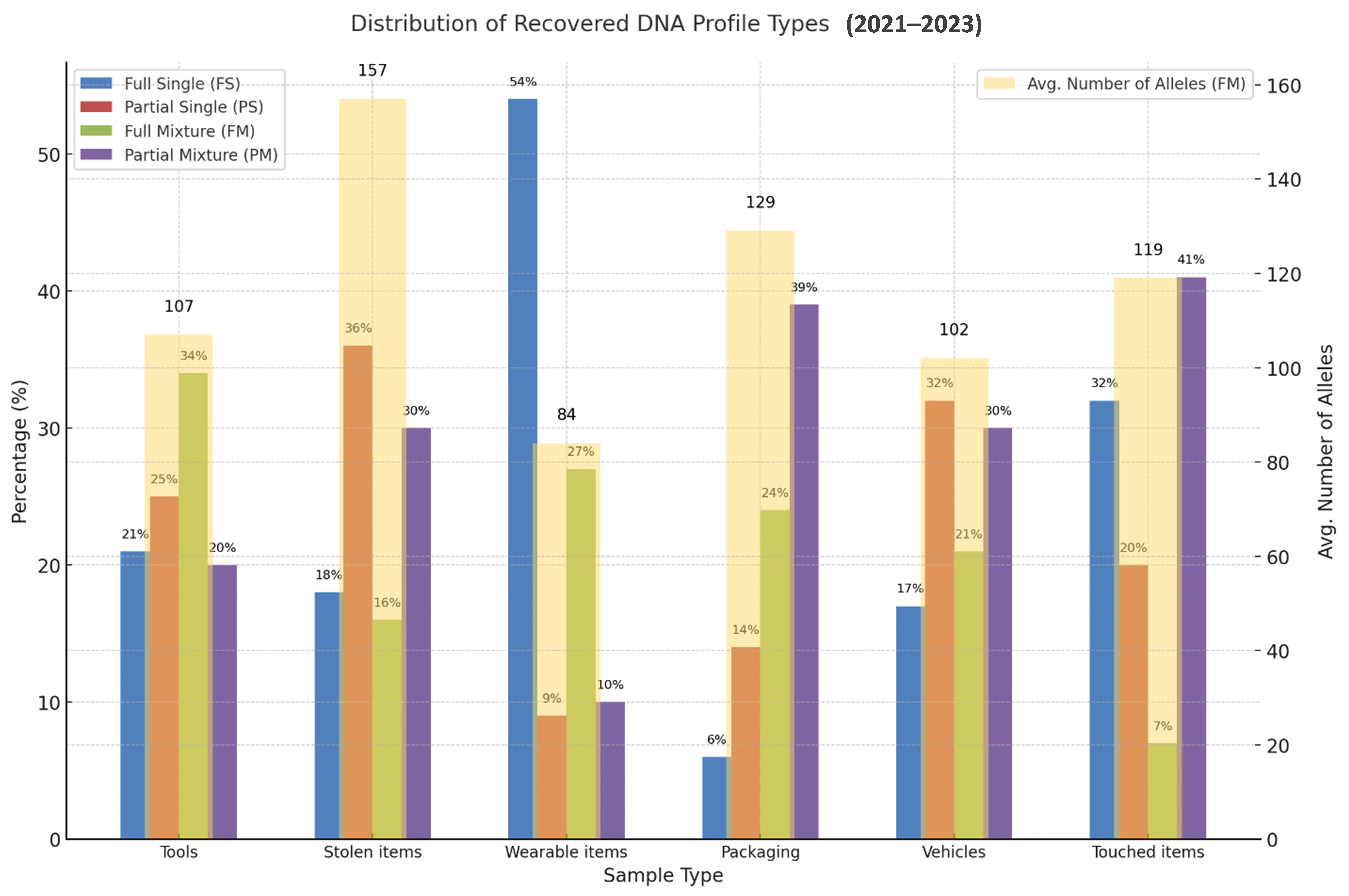 Figure 3 were gathered by analyzing trace DNA samples. These samples were categorized into six distinct item types—tools, stolen items, wearable items, packaging, vehicles, and touched items—to examine how different evidence categories may influence DNA recovery and profiling. Finally,