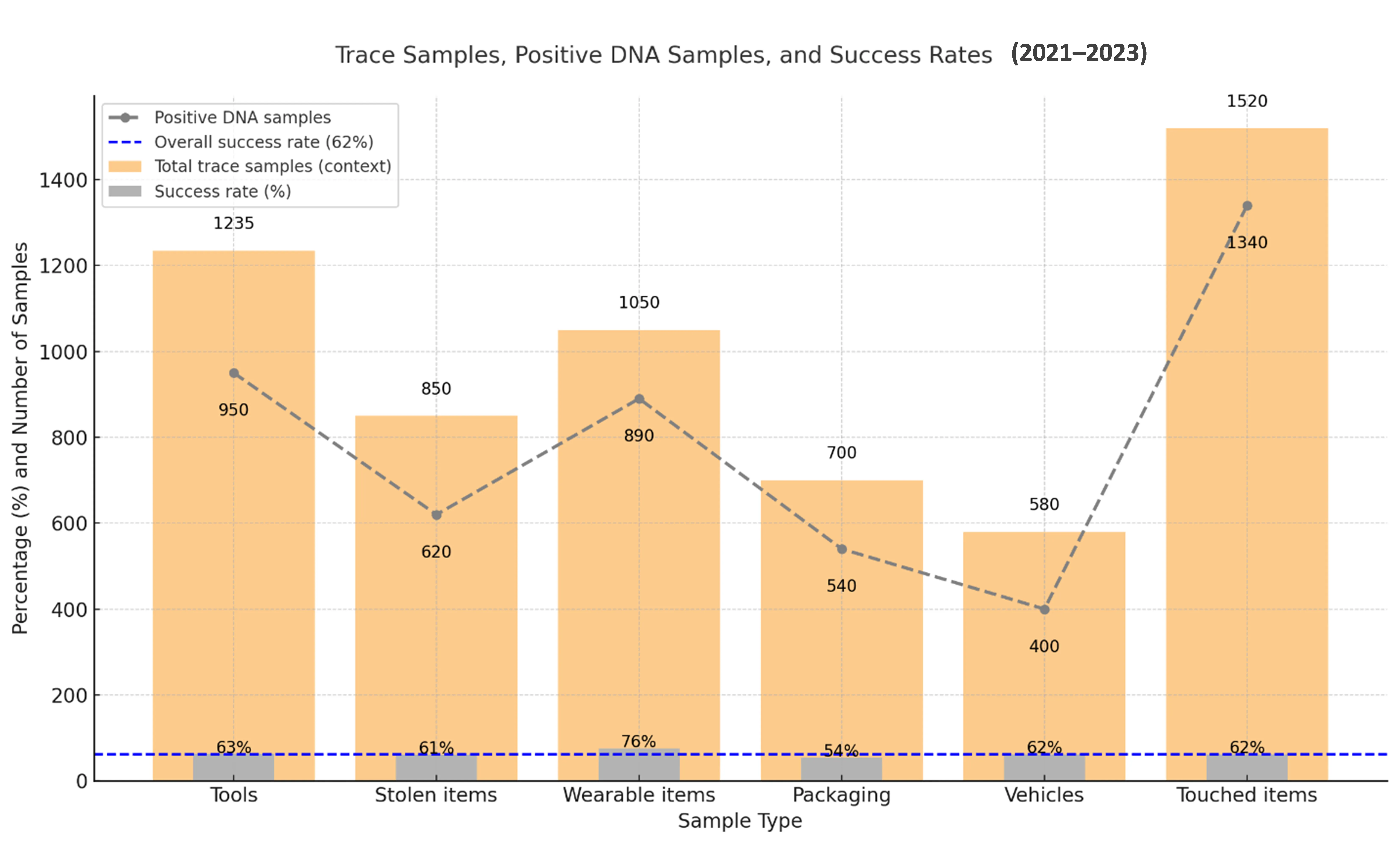 The DNA profiling process yielded 7003 positive DNA results, achieving an overall success rate of 81.5% for all types of samples, including trace samples. This high success rate underscores the efficiency and precision of the Biology and DNA Section in extracting usable profiles from prioritized samples, highlighting robust methodologies for DNA extraction and the effective prioritization of high-quality samples.