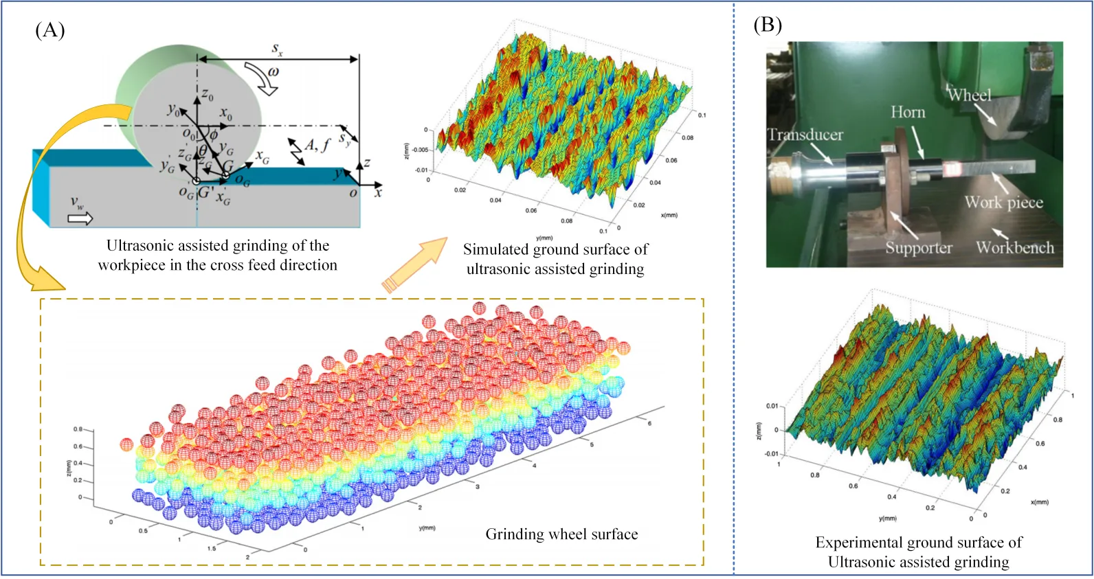 4]. Excessive grinding force, high grinding temperature and severe wear of abrasive tools usually occur when grinding advanced materials by conventional machining methods. Numerous scholars have continuously improved on the basis of traditional grinding and proposed some new special processing methods, among which UVAG has become a very important processing means. Ultrasonic vibration-assisted grinding refers to the application of high-frequency vibration on the grinding tool or workpiece to change the material removal mechanism, reduce the grinding force and grinding heat, and thus improve the quality of the machined surface [