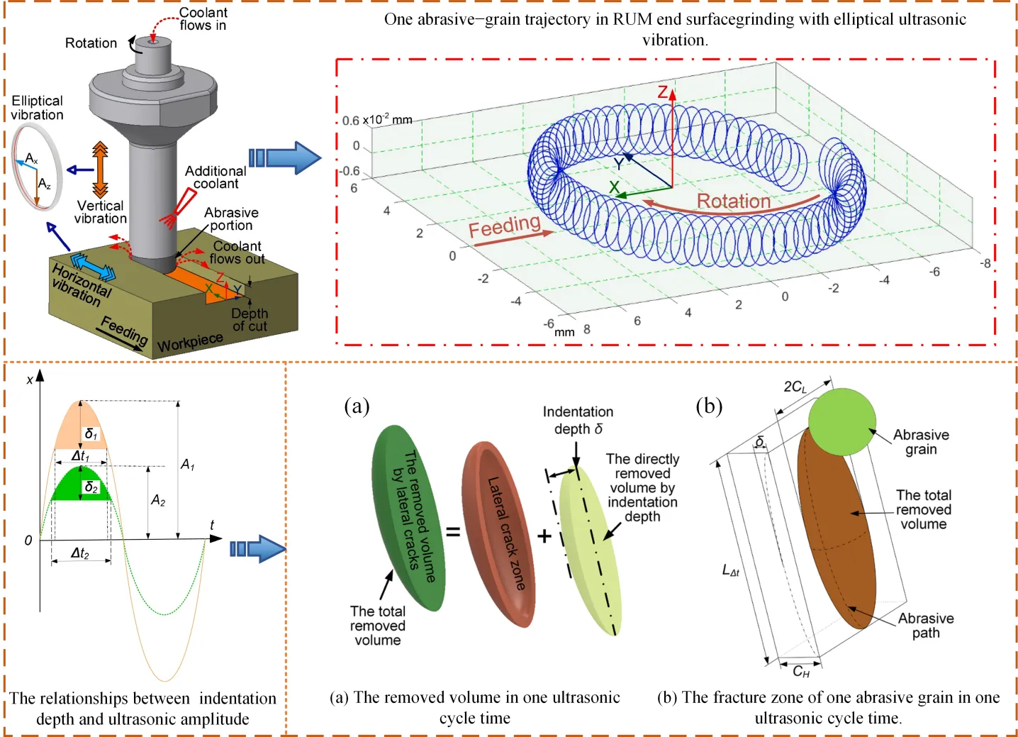 Compared to sinusoidal ultrasonic vibration machining, two-dimensional ultrasonic vibration machining was born later. Two-dimensional vibration can be divided into two-dimensional elliptical ultrasonic vibration parallel to the surface of the workpiece and elliptical ultrasonic vibration parallel to the end face of the grinding wheel. The main value of two-dimensional elliptical ultrasonic vibration is to improve the material removal rate, but in terms of machining performance, elliptical ultrasonic vibration has a greater advantage. As shown in , Wang et al. [