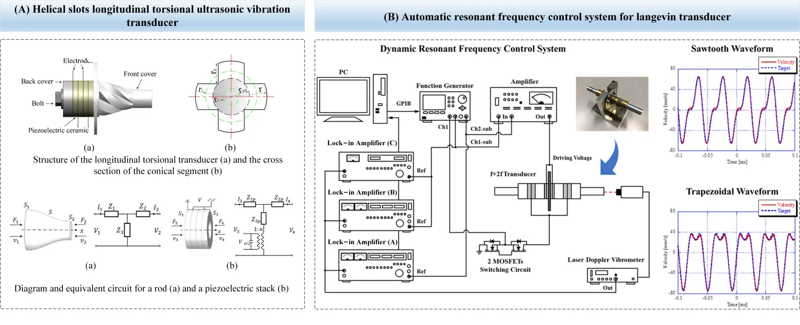 28] developed a drive measurement system capable of real-time monitoring of the operating parameters and states such as voltage, current, vibration amplitude, impedance amplitude and phase of the ultrasonic transducer in response to the resonance frequency shift and electrical impedance changes that are prone to occur in ultrasonic transducers, especially high-power transducers. As shown in B, Hachisuka et al. [