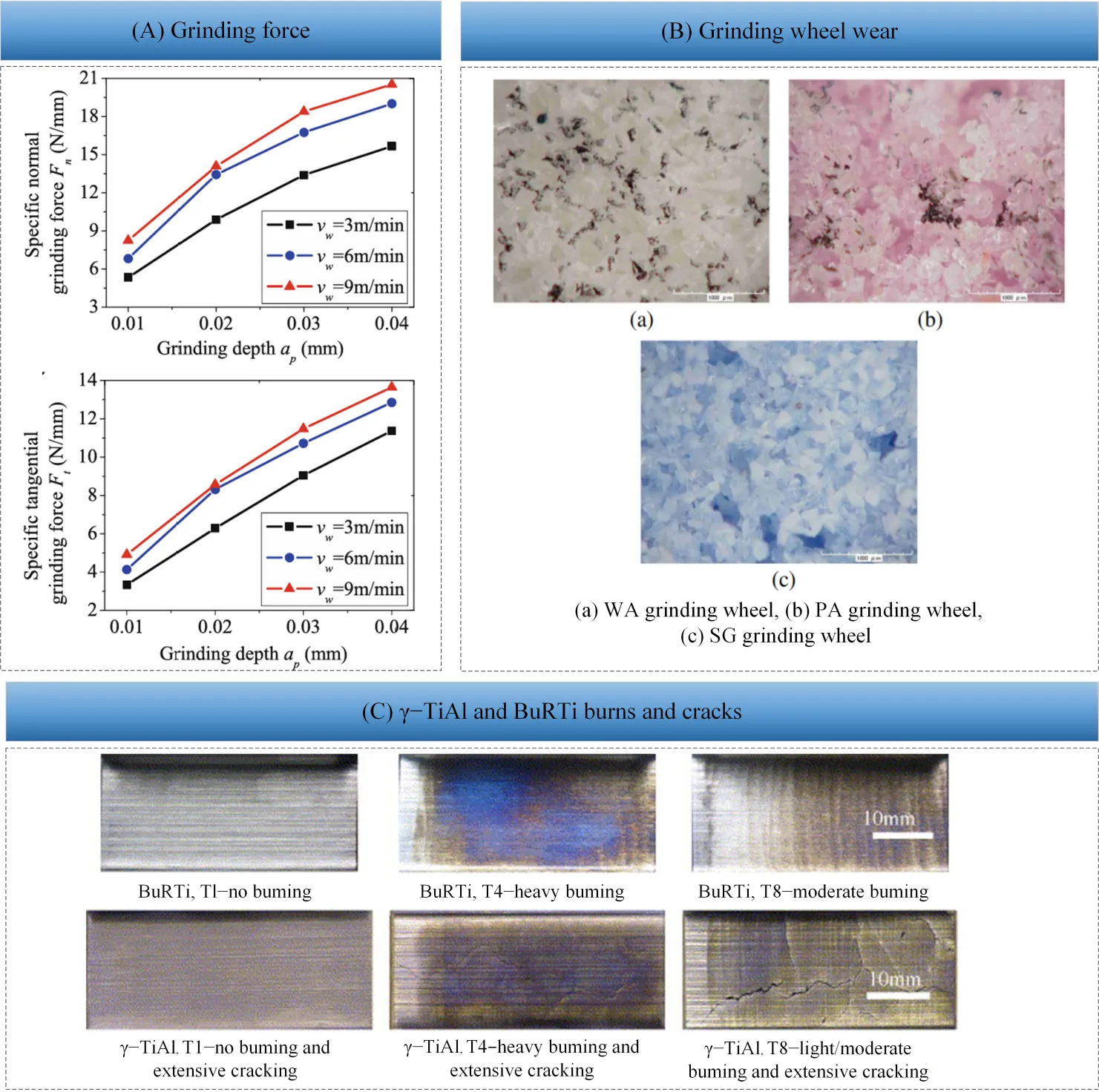 8] conducted a study on deep-cut grinding of (TiCp+TiBw)/Ti-6Al-4V using white alumina (WA), pink fused alumina (PA) and microcrystal corundum (SG) abrasive wheels. They found that the grinding force was highest with the WA wheel, followed by the PA wheel, and lowest with the SG wheel. Additionally, they observed significant adhesion to the grinding wheel when using the WA and PA wheels, while almost no material adhered to the SG wheel.