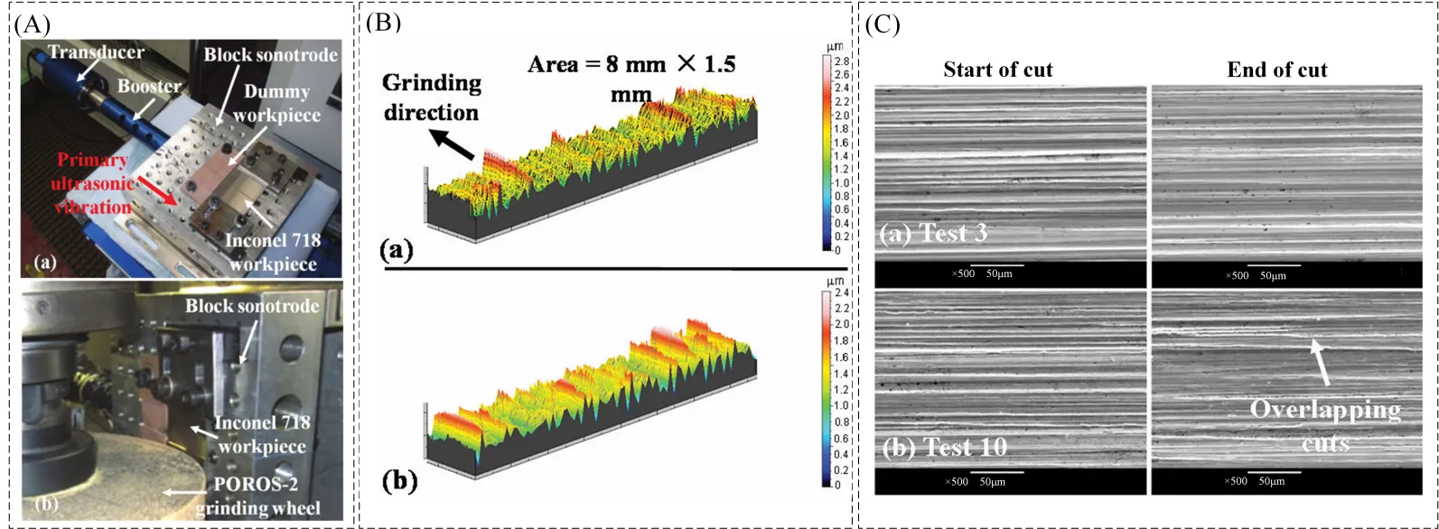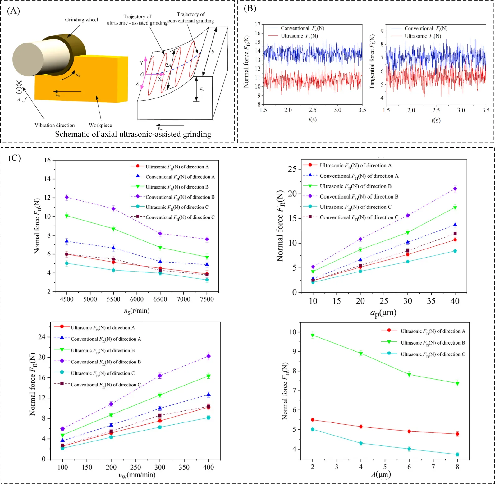 14] further stated that radial ultrasonic vibration may deteriorate surface quality and increase surface roughness compared to axial ultrasonic vibration. Radial ultrasonic vibration is more effective in reducing the ultrasonic grinding force, but it slightly reduces the surface quality and is more suitable for grinding hard and brittle materials. For tangential vibration, it is mainly used for deep, slow feed grinding and other conditions of slow wheel speed, and will also deteriorate the surface quality to a certain extent, and need to make an appropriate selection of processing parameters. While axial ultrasonic vibration can effectively improve the surface roughness and also reduce the grinding force.