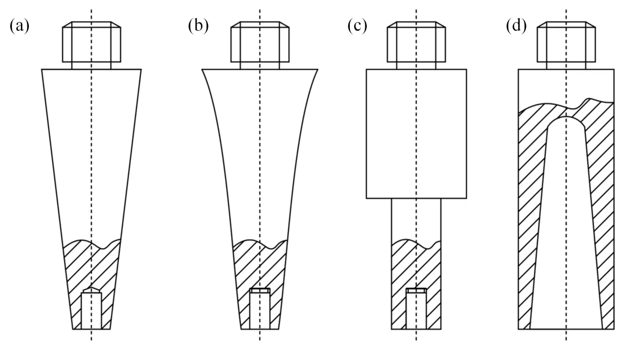 . Common ultrasonic horn. (<b>a</b>) Conical, (<b>b</b>) Exponential, (<b>c</b>) Stepped, (<b>d</b>) Hollow Exponential [