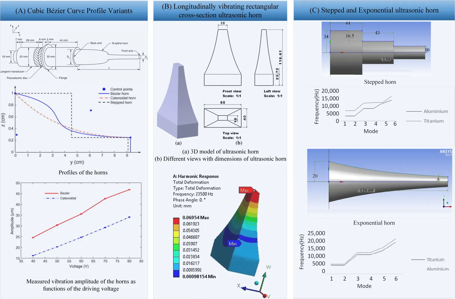 31] developed a large amplitude amplification factor ultrasonic horn with a cubic Bézier curve profile and developed a design program using multi-objective optimization algorithm and finite element analysis to optimize the displacement amplification of the horn. It has been experimentally proven that displacement amplification is 71% higher than that of traditional chain ultrasonic horns with the same length and end face diameter. Nad et al. [